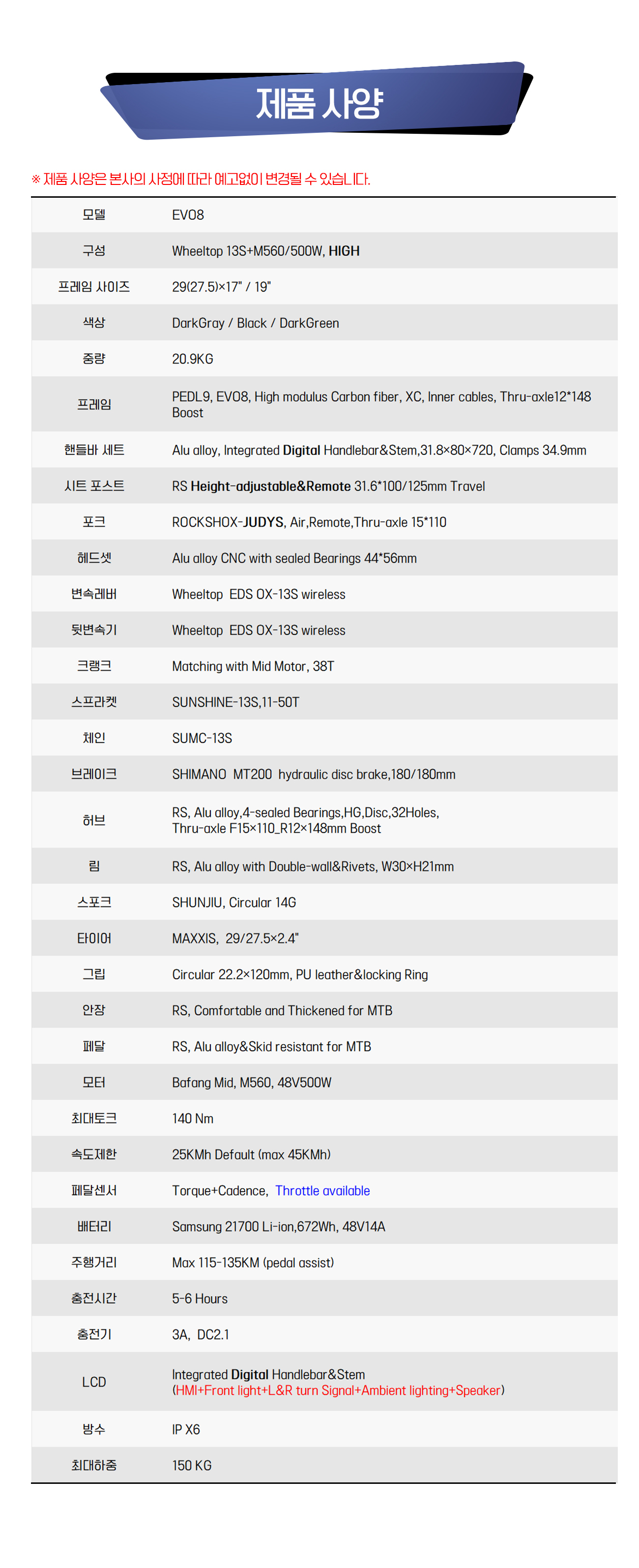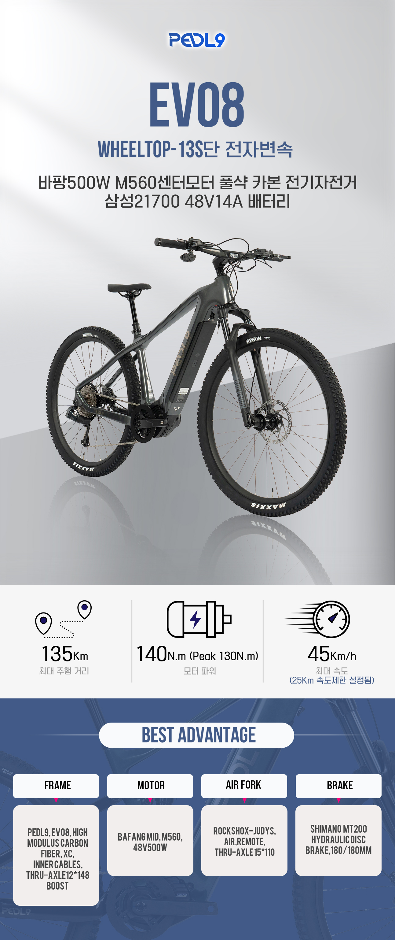 PEDL9 전기자전거 EVO8 EDS OX13단 전자변속 풀카본 바팡M560 500W센터모터 락샥 디지털핸들바 가변싯포